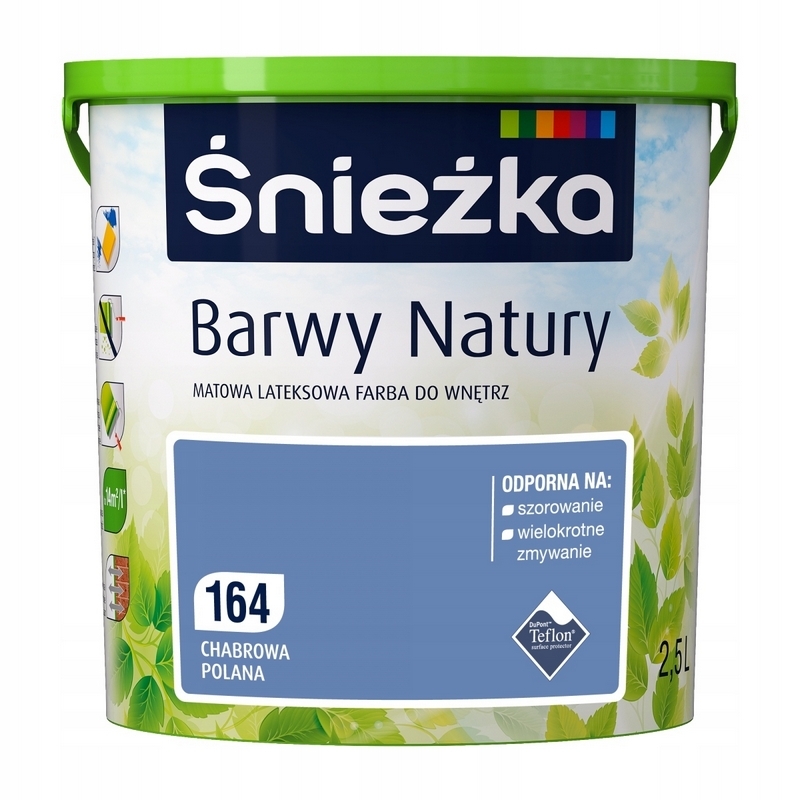 Zawarty w Śnieżce BARWY NATURY Teflon zapewnia wysoką trwałość wymalowań, ułatwia czyszczenie, usuwanie plam i zabrudzeń,