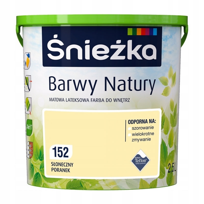 Zawarty w Śnieżce BARWY NATURY Teflon zapewnia wysoką trwałość wymalowań, ułatwia czyszczenie, usuwanie plam i zabrudzeń,