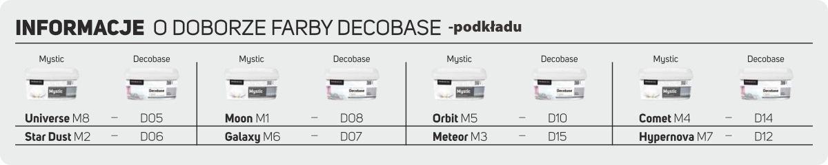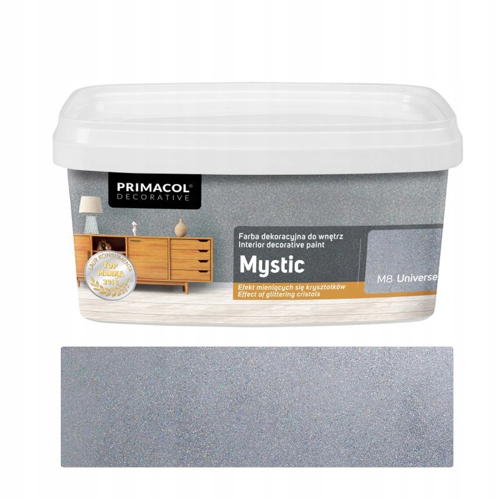 Łatwa w użyciu dekoracyjna farba do wnętrz. Tysiące zawartych w farbie drobinek, iskrząc i mieniąc się w świetle nadają powierzchniom spektakularny efekt wizualny. Mystic doskonale sprawdza się zarówno w bardzo nowoczesnych jak i klasycznych wnętrzach, całkowicie odmieniając wygląd pomieszczeń. Produkt jest dostępny w palecie gotowych kolorów.