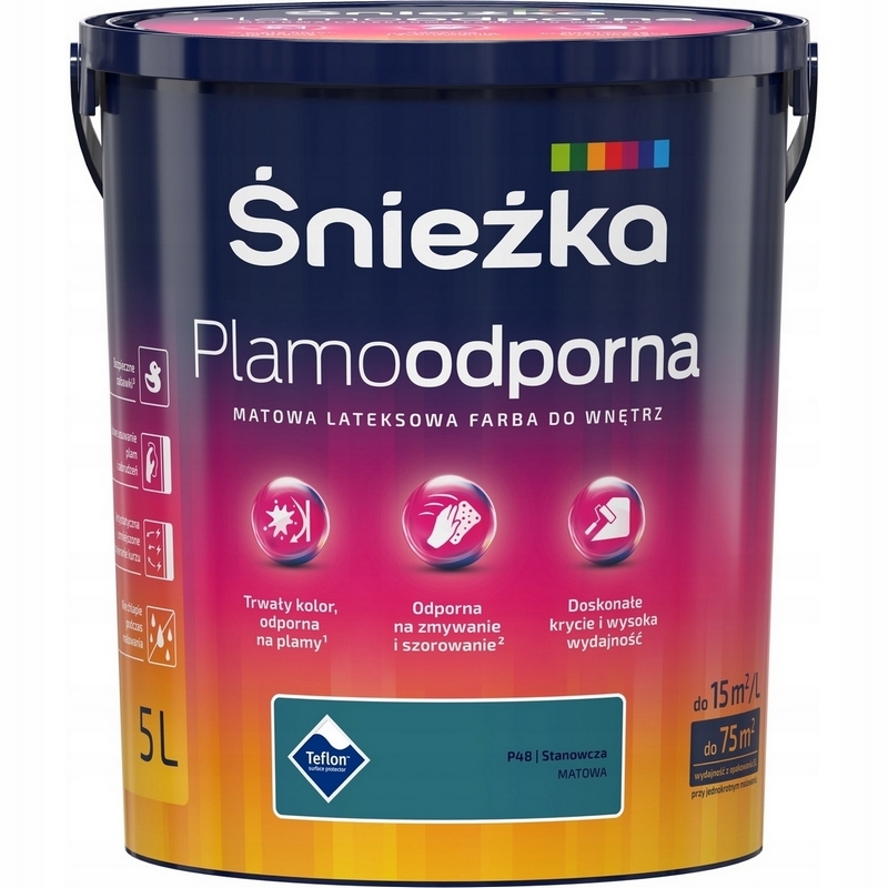 ¹Plamoodporność: odporność powłoki produktu nałożonej w procesie malowania na określoną gładką i wysezonowaną powierzchnię zgodnie z instrukcją Producenta wskazaną na opakowaniu produktu oraz w Karcie Technicznej Produktu – na plamy powstałe w wyniku zabrudzenia powłoki wywołane substancjami takimi jak: koncentrat z buraków, majonez, masło, oliwa z oliwek, napój typu cola, sok pomarańczowy, sok marchewkowy, sok pomidorowy, keczup, czekolada mleczna, mleko, sos sojowy, musztarda, olej, przyprawa typu maggi, ziemia i pod warunkiem usunięcia takich substancji zgodnie z instrukcją Producenta wskazaną na opakowaniu produktu oraz w Karcie Technicznej Produktu. Ze względu na wielość i różnorodność czynników (np. typ malowanego podłoża, skład chemiczny produktów różnych producentów np. substancje żrące, czas usunięcia plamy) w niektórych szczególnych przypadkach mogą wystąpić trudności w usunięciu plam.