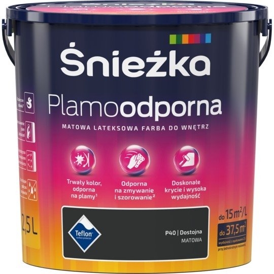 Śnieżka Plamoodporna to lateksowa, matowa farba do aranżacji wnętrz, stworzona z myślą o najbardziej wymagających odbiorcach, którzy poszukują innowacyjnych rozwiązań skrojonych pod ich osobowość i styl. Produkt charakteryzuje się wyjątkową odpornością na plamy, zmywanie i szorowanie na mokro, a więc sprawdzi się nawet w trudnych warunkach. W palecie kolorystycznej Śnieżki Plamoodpornej znalazło się aż 48 trwałych kolorów, co daje ogromne możliwości w zakresie wyboru idealnego odcienia zgodnie z własnymi preferencjami. Dodatkowo, wyrób jest łatwy w użyciu, doskonale kryje i nie chlapie podczas malowania. Spełnia ponadto surowe wymagania europejskiej normy „Bezpieczne zabawki”. Twój ulubiony kolor? Plamoodporny!