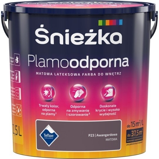 Śnieżka Plamoodporna to lateksowa, matowa farba do aranżacji wnętrz, stworzona z myślą o najbardziej wymagających odbiorcach, którzy poszukują innowacyjnych rozwiązań skrojonych pod ich osobowość i styl. Produkt charakteryzuje się wyjątkową odpornością na plamy, zmywanie i szorowanie na mokro, a więc sprawdzi się nawet w trudnych warunkach. W palecie kolorystycznej Śnieżki Plamoodpornej znalazło się aż 48 trwałych kolorów, co daje ogromne możliwości w zakresie wyboru idealnego odcienia zgodnie z własnymi preferencjami. Dodatkowo, wyrób jest łatwy w użyciu, doskonale kryje i nie chlapie podczas malowania. Spełnia ponadto surowe wymagania europejskiej normy „Bezpieczne zabawki”. Twój ulubiony kolor? Plamoodporny!