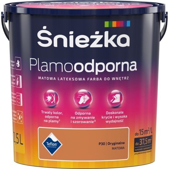 Śnieżka Plamoodporna to lateksowa, matowa farba do aranżacji wnętrz, stworzona z myślą o najbardziej wymagających odbiorcach, którzy poszukują innowacyjnych rozwiązań skrojonych pod ich osobowość i styl. Produkt charakteryzuje się wyjątkową odpornością na plamy, zmywanie i szorowanie na mokro, a więc sprawdzi się nawet w trudnych warunkach. W palecie kolorystycznej Śnieżki Plamoodpornej znalazło się aż 48 trwałych kolorów, co daje ogromne możliwości w zakresie wyboru idealnego odcienia zgodnie z własnymi preferencjami. Dodatkowo, wyrób jest łatwy w użyciu, doskonale kryje i nie chlapie podczas malowania. Spełnia ponadto surowe wymagania europejskiej normy „Bezpieczne zabawki”. Twój ulubiony kolor? Plamoodporny!