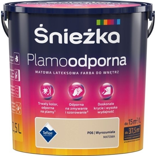 Śnieżka Plamoodporna to lateksowa, matowa farba do aranżacji wnętrz, stworzona z myślą o najbardziej wymagających odbiorcach, którzy poszukują innowacyjnych rozwiązań skrojonych pod ich osobowość i styl. Produkt charakteryzuje się wyjątkową odpornością na plamy, zmywanie i szorowanie na mokro, a więc sprawdzi się nawet w trudnych warunkach. W palecie kolorystycznej Śnieżki Plamoodpornej znalazło się aż 48 trwałych kolorów, co daje ogromne możliwości w zakresie wyboru idealnego odcienia zgodnie z własnymi preferencjami. Dodatkowo, wyrób jest łatwy w użyciu, doskonale kryje i nie chlapie podczas malowania. Spełnia ponadto surowe wymagania europejskiej normy „Bezpieczne zabawki”. Twój ulubiony kolor? Plamoodporny!