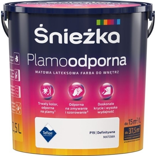 Śnieżka Plamoodporna to lateksowa, matowa farba do aranżacji wnętrz, stworzona z myślą o najbardziej wymagających odbiorcach, którzy poszukują innowacyjnych rozwiązań skrojonych pod ich osobowość i styl. Produkt charakteryzuje się wyjątkową odpornością na plamy, zmywanie i szorowanie na mokro, a więc sprawdzi się nawet w trudnych warunkach. W palecie kolorystycznej Śnieżki Plamoodpornej znalazło się aż 48 trwałych kolorów, co daje ogromne możliwości w zakresie wyboru idealnego odcienia zgodnie z własnymi preferencjami. Dodatkowo, wyrób jest łatwy w użyciu, doskonale kryje i nie chlapie podczas malowania. Spełnia ponadto surowe wymagania europejskiej normy „Bezpieczne zabawki”. Twój ulubiony kolor? Plamoodporny!
