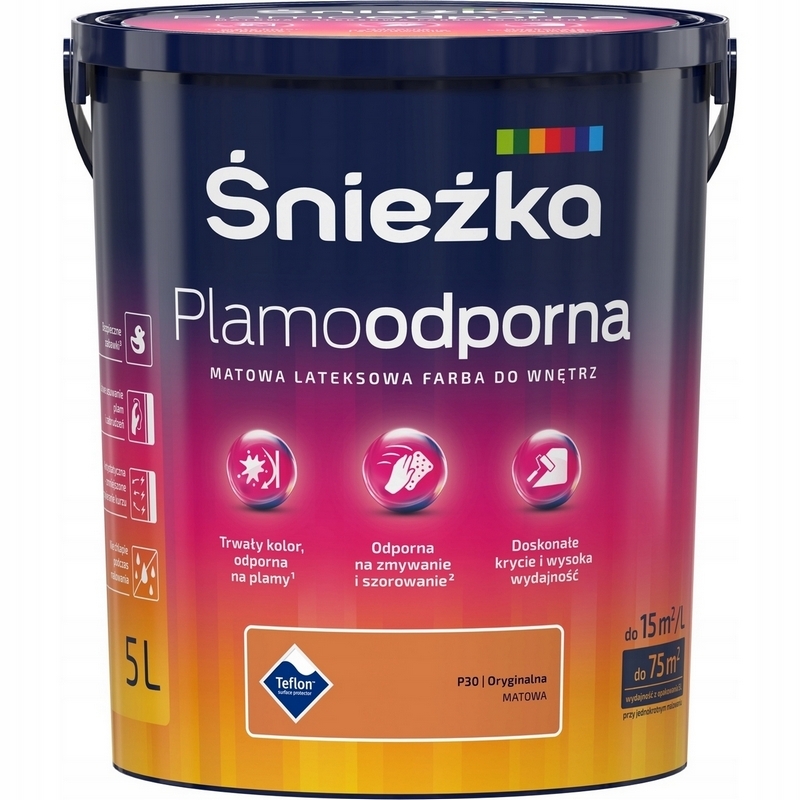 ¹Plamoodporność: odporność powłoki produktu nałożonej w procesie malowania na określoną gładką i wysezonowaną powierzchnię zgodnie z instrukcją Producenta wskazaną na opakowaniu produktu oraz w Karcie Technicznej Produktu – na plamy powstałe w wyniku zabrudzenia powłoki wywołane substancjami takimi jak: koncentrat z buraków, majonez, masło, oliwa z oliwek, napój typu cola, sok pomarańczowy, sok marchewkowy, sok pomidorowy, keczup, czekolada mleczna, mleko, sos sojowy, musztarda, olej, przyprawa typu maggi, ziemia i pod warunkiem usunięcia takich substancji zgodnie z instrukcją Producenta wskazaną na opakowaniu produktu oraz w Karcie Technicznej Produktu. Ze względu na wielość i różnorodność czynników (np. typ malowanego podłoża, skład chemiczny produktów różnych producentów np. substancje żrące, czas usunięcia plamy) w niektórych szczególnych przypadkach mogą wystąpić trudności w usunięciu plam.