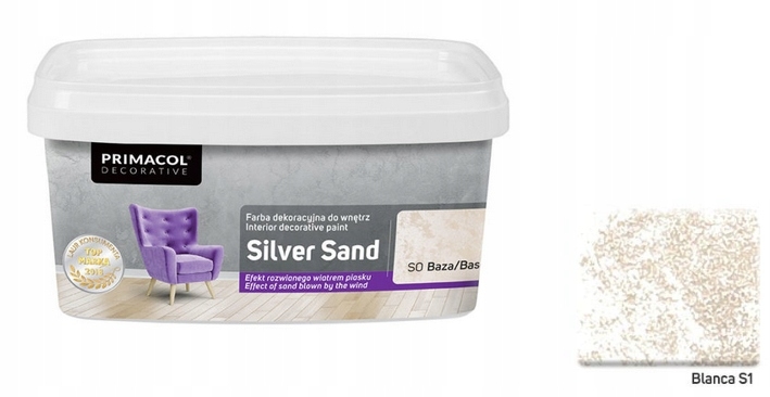 Farba Silver Sand służy do dekoracyjnego wykańczania i zdobienia ścian wewnątrz pomieszczeń. Oświetlone powierzchnie pokryte farbą mienią się perłowymi refleksami, tworząc trójwymiarowy efekt głębi. Doskonałe efekty wizualne otrzymujemy zarówno przy świetle sztucznym jak i naturalnym. Silver Sand zawiera specjalistyczne dodatki strukturalne, które w trakcie aplikacji tworzą wzór niczym rozsypany wiatrem piasek. Dzięki oryginalnej, delikatnej strukturze stanowi niepowtarzalną ozdobę każdego wnętrza. Idealnie sprawdza się w salonach, pokojach dziennych, korytarzach a także salach konferencyjnych, hotelach i restauracjach. W celu zaakcentowania wybranego koloru Silver Sand może być dodatkowo barwiony Kolorantami Primacol Decorative..