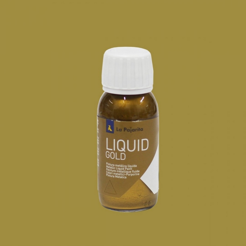 Farba metaliczna Liquid Gold na bazie alkoholu. Do uzyskiwania intensywnego metalicznego efektu pozłocenia. Łatwa w stosowaniu i szybkoschnąca. Dobrze kryje i daje bogaty kolor dzięki swojej formule metalicznych pigmentów. Można ją postarzyć używając bitumu lub ciemnego wosku bez utraty metalicznego wyglądu. Do użycia na drewnie, kartonie, gipsie, kamieniu, metalu, żywicy itp. można ją nakładać pędzlem, wałkiem lub aerografem. Należy dobrze wstrząsnąć przed użyciem. Używać w dobrze wentylowanym pomieszczeniu. Czas schnięcia 10 minut. Rozcieńczyć można alkoholem lub acetonem. Nieodpowiednie dla dzieci w wieku poniżej 36 miesięcy. Trzymać poza zasięgiem dzieci. Pojemność 50 ml. Made in Spain.