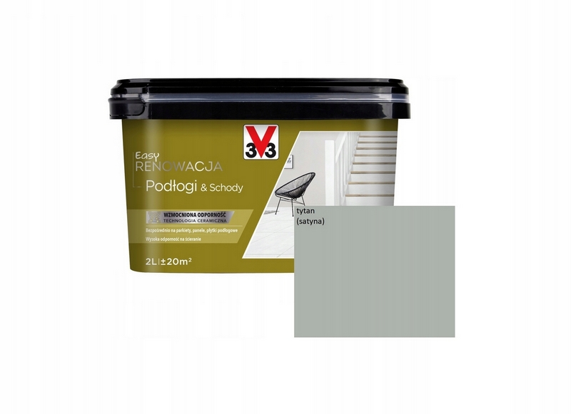 - V33 Easy renowacja PODŁOGI i SCHODY to wysoko wyspecjalizowana farba do malowania, odnawiania podłóg drewnianych, paneli podłogowych, płytek podłogowych oraz twardych podłóg kamiennych: marmur i granit.