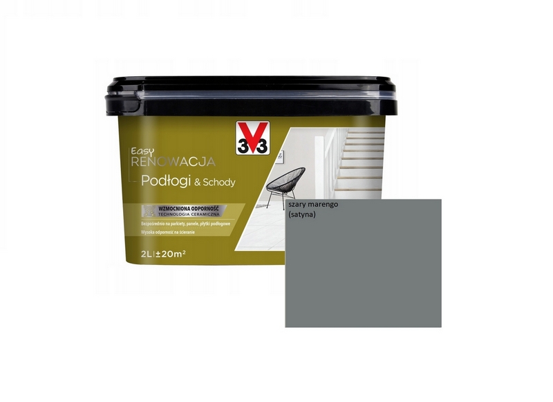 - V33 Easy renowacja PODŁOGI i SCHODY to wysoko wyspecjalizowana farba do malowania, odnawiania podłóg drewnianych, paneli podłogowych, płytek podłogowych oraz twardych podłóg kamiennych: marmur i granit.