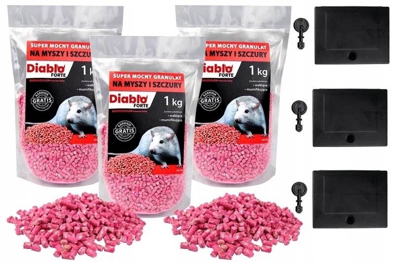 DIABLO FORTE BROMADIOLON 3kg DFG1R (3 x 1kg) - trutka w granulacie na myszy i szczury + 3 x karmnik deratyzacyjny z kluczykiem MOUSE BOX