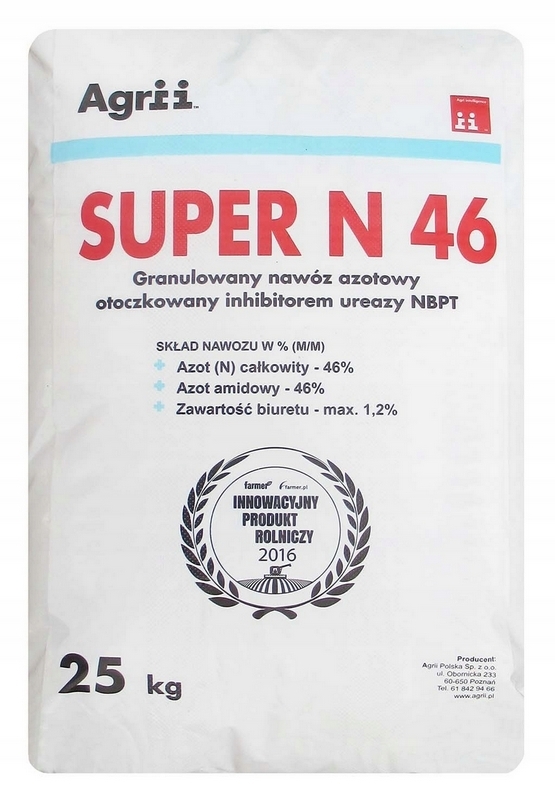 Super N46 to nowoczesny, granulowany nawóz azotowy z powłoką z inhibitora ureazy NBPT i nośnika MDGE. Specjalna powłoka w czasie rozpuszczania nawozu, eliminuje straty azotu w wyniku utleniania amoniaku do atmosfery i wymywania azotu w głąb profilu glebowego. Super N nie powoduje zakwaszania gleby, które występuje w przypadku stosowania tradycyjnych nawozów azotowych takich jak: mocznik, saletra amonowa czy saletrzak.