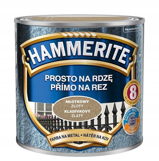Hammerite Prosto Na Rdzę – efekt młotkowy – to nowoczesna, jednoskładnikowa farba, schnąca na powietrzu, przeznaczona do antykorozyjnego i dekoracyjnego malowania metali żelaznych (stal, żeliwo), zarówno tych pokrytych rdzą, jak i czystych. Może być również stosowana do zabezpieczenia metali nieżelaznych po odpowiednim zagruntowaniu. Wykończenie w efekcie młotkowym zapewnia niepowtarzalne walory estetyczne i długotrwałą ochronę antykorozyjną.
