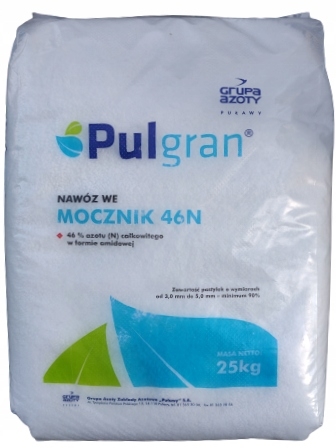 Mocznik.pl® zawiera 46% azotu (N) w formie amidowej, która jest dobrze pobierana pozakorzeniowo (dolistnie) przez rośliny. Pobieranie przez system korzeniowy jest wolniejsze, ponieważ w glebie mocznik przechodzi w wyniku hydrolizy enzymatycznej w dostępną dla roślin formę amonową, a następnie w azotanową.