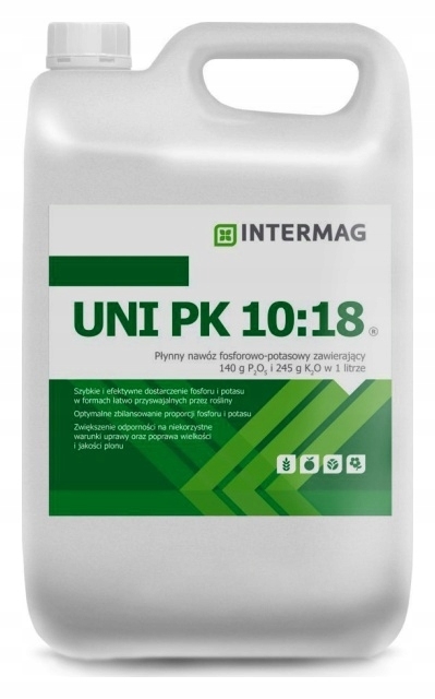 Uni PK 10:18 to płynny nawóz zawierający fosfor i potas (140 g P2O5 i 245 g K2O w 1 litrze) w formach łatwo dostępnych dla roślin. Stosowany nalistnie w zabiegach dokarmiania dolistnego szybko dostarcza roślinom fosfor i potas. Zastosowanie nawozu intensyfikuje wzrost i rozwój systemu korzeniowego, części wegetatywnych i generatywnych roślin oraz wpływa korzystnie na parametry jakościowe plonu. Nawóz polecany jest zwłaszcza w fazach intensywnego wzrostu roślin, w warunkach utrudnionego pobierania fosforu i potasu z gleby oraz w okresach zwiększonego zapotrzebowania roślin na te składniki pokarmowe. Szczególnie polecany w okresach suszy i niskiej temperatury, a także w okresie kształtowania parametrów jakościowych plonu.