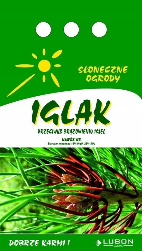 "Iglak przeciwko brązowieniu igieł" to bardzo skuteczny, nowoczesny nawóz mineralny. Dzięki zawartości magnezu w łatwo przyswajalnej po jego zastosowaniu nie dochodzi do przebarwień igieł. Polecany również pod rośliny, u których występują objawy niedoboru magnezu. Sprawia, że rośliny są soczyście zielone i zdrowe.