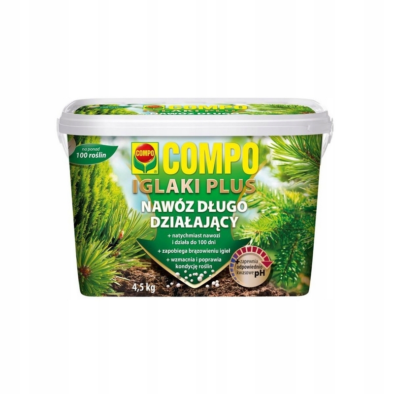 - Zalety produktu Wysoka dawka magnezu zapobiega brunatnieniu i zapewnia soczyście zieloną barwę igieł. System kontrolowanego uwalniania substancji odżywczych zapewnia gęste i mocne rośliny oraz aktywuje wzrost systemu korzeniowego bez ryzyka przenawożenia. Odżywia rośłiny natychmiast po zstosowaniu i działa przez 3 miesiące.