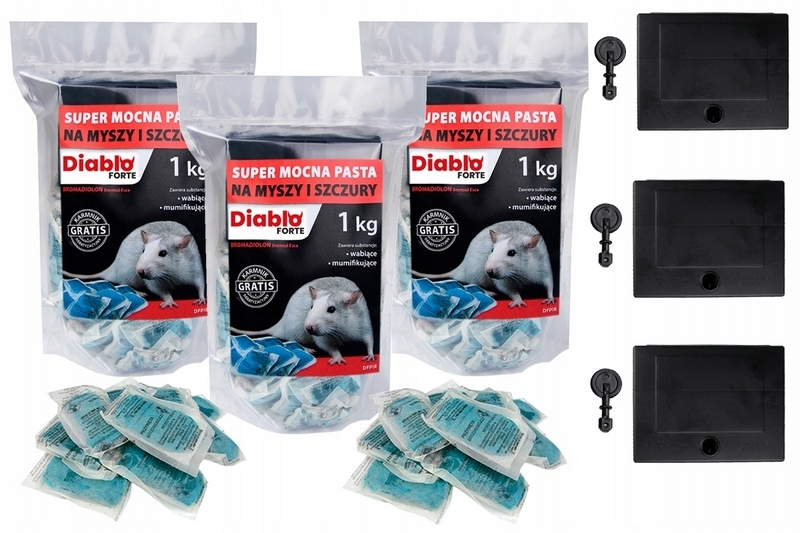 DIABLO FORTE pasta Bromadiolon 3kg DFP1R (3 x1kg) - trutka w saszetkach na myszy i szczury + 3 x karmnik deratyzacyjny z kluczykiem MOUSE BOX