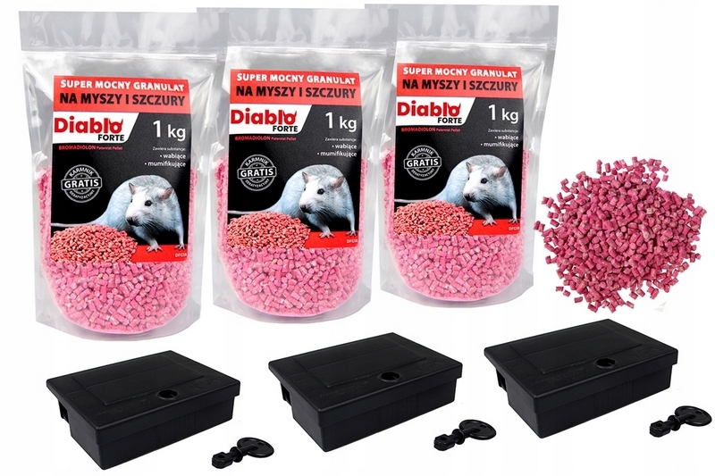 DIABLO FORTE BROMADIOLON 3kg DFG1R (3 x 1kg) - trutka w granulacie na myszy i szczury + 3 x karmnik deratyzacyjny z kluczykiem MOUSE BOX