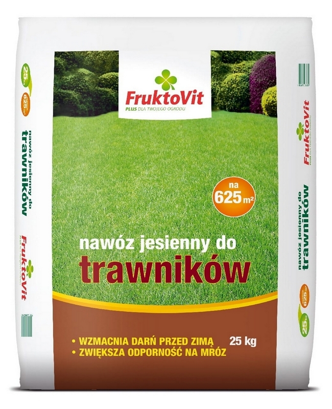 FruktoVit PLUS nawóz jesienny do trawników zawiera składniki mineralne, które zaspokajają zapotrzebowanie pokarmowe trawnika jesienią oraz zapewniają lepszy start już od wczesnej wiosny. Obniżona zawartość azotu przedłuża okres wegetacji i wpływa na ładny wygląd trawnika do późnej jesieni. Natomiast podwyższona zawartość potasu przyczynia się do lepszego przezimowania i zwiększa odporność trawników na choroby. Nawóz szczególnie polecamy do stosowania na trawnikach ozdobnych i reprezentacyjnych. Regularne stosowanie nawozu zapewnia lepszy start trawnika już od wczesnej wiosny, ładny wygląd trawnika do póznej jesieni oraz zwiększa odporność traw na choroby i przemarzanie.