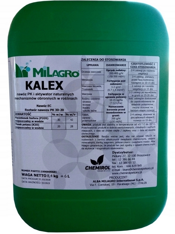 OSTRZEŻENIE: Bardzo ważne jest, aby nie używać KALEX w roztworach z bardzo alkalicznymi związkami chemicznymi, olejami mineralnymi, siarką, wapniem, polisiarczkami i związkami miedzi. Alba Milagro gwarantuje, że produkt ten jest zgodny z opisem chemicznym na etykiecie i oryginalnym opakowaniu.