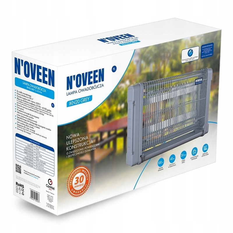 o mocy 20 Wat przeznaczona jest do użytku wewnętrznego, zalecana do pomieszczeń o powierzchni do 100m2. Wykonana z metalu oraz wysokiej jakości tworzyw. Skutecznie zwalcza wszelkie owady latające: komary, muchy i octówki. Lampa wytwarza światło, które wabi latające owady. Owady giną rażone prądem po dotknięciu siatki pod wysokim napięciem.