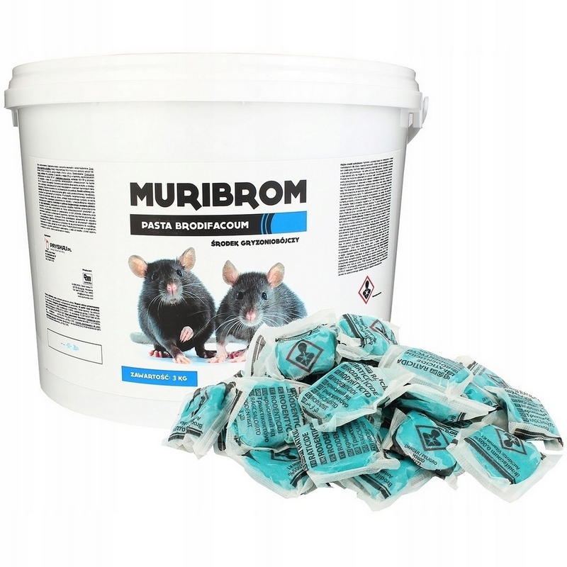 MURIBROM pasta dzięki smakowitym składnikom mieszkanki jest wykrywana przez gryzonie z dużej odległości. Zawiera brodifacoum - w 100% śmiertelny już po jednorazowym spożyciu. Gryzonie giną bezstresowo, z powodu wewnętrznego krwotoku, długo po spożyciu i daleko od miejsca wyłożenia. Tym sposobem inne gryzonie nie stają się podejrzliwe i nadal spożywają przynętę aż do całkowitej eksterminacji. Dodatkowo zawiera także gorzką substancje, która zapobiega przypadkowemu połknięciu.