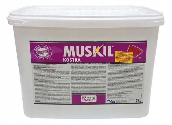 Muskil kostka jest gotową do użycia przynętą w postaci kostek woskowych, do zwalczania szczurów i myszy, zawierająca kombinację dwóch antykoagulantów drugiej generacji - difenakum i bromadiolon. Produkt jest skuteczny w zwalczaniu szczurów i myszy już po pobraniu przez nie pojedyńczej dawki. Gryzonie giną po kilku dniach (3-5) od pobrania preparatu, nie powodując nieufności do przynęty u innych osobników z kolonii. Muskil kostka zawiera kompozycję składników pokarmowych, które zachęcają gryzonie do jej pobrania, dzięki zawartości parafiny przynęta jest szczególnie odporna w warunkach wilgoci, a wyżłobienia kostki ułatwiają gryzienie przez szkodniki.