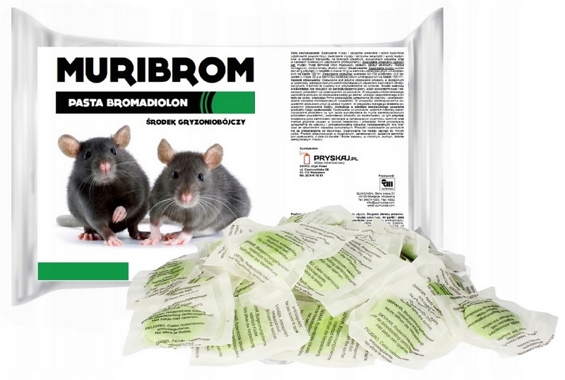 MURIBROM PRO pasta dzięki smakowitym składnikom mieszanki jest wykrywana przez gryzonie z dużej odległości. Zawiera bromadiolon - w 100% śmiertelny już po jednorazowym spożyciu. Gryzonie giną bezstresowo, z powodu wewnętrznego krwotoku, długo po spożyciu i daleko od miejsca wyłożenia. Tym sposobem inne gryzonie nie stają się podejrzliwe i nadal spożywają przynętę aż do całkowitej eksterminacji. 100% śmiertelność po pojedynczym spożyciu. Dodatkowo zawiera także gorzką substancje, która zapobiega przypadkowemu połknięciu.