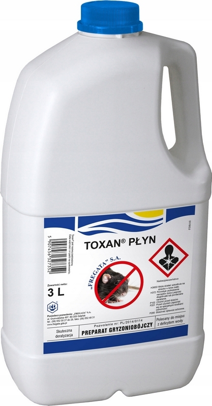 Trutka na myszy i szczury do zwalczania gryzoni. Przeznaczona do stosowania w pomieszczeniach gdzie występują gryzonie. Płyn Toxan można stosować jako płyn w poidłach dla gryzoni. To szczególnie skuteczna metoda walki ze szczurami i myszami w upalne dni, gdy brakuje wody do picia.