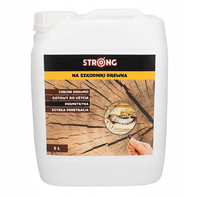 Owadobójczy preparat STRONG NA SZKODNIKI DREWNA to środek ochronny nowej generacji, stosowany do zwalczania szkodników drewna. Szczególnie skuteczny przeciwko kołatkom (Anobium Punctatum), spuszczelom (Hylotrupes bajulus), miazgowcom (Lyctus brunneus), trzpiennikom (Sirex gigas), termitom, kornikom i innym.