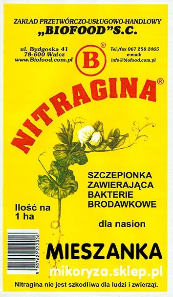 Zaprawianie na mokro stosując 1 opakowanie Nitraginy na materiał siewny przeznaczony na 1ha. Zwilżyć nasiona przygotowaną zawiesiną preparatu.