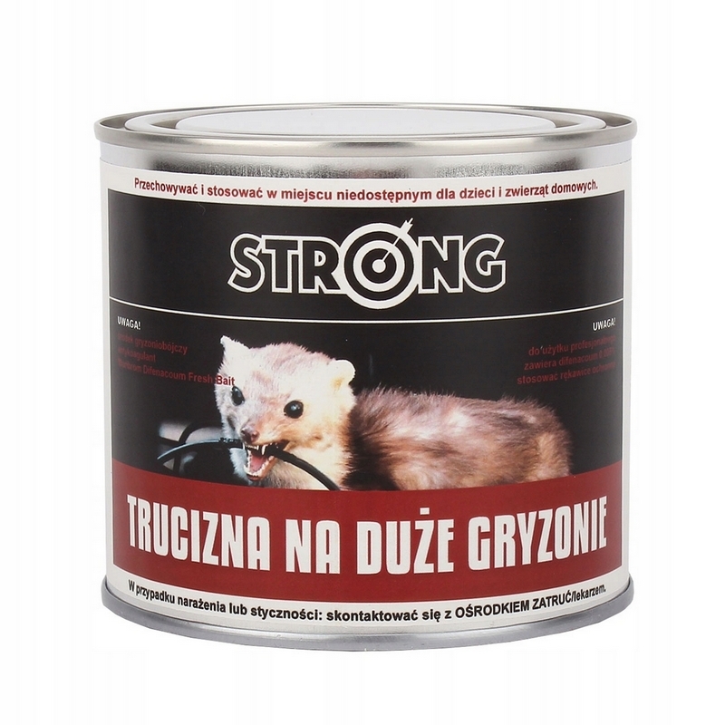 STRONG TRUCIZNA NA DUŻE GRYZONIE to silny preparat gryzoniobójczy skuteczny przeciw trudnym do zwalczania gryzoniom. Preparat dzięki smakowitym składnikom mieszkanki jest wykrywany przez szkodniki nawet ze znacznej odległości, a dzięki zawartości sprawdzonej substancji czynnej - DIFENACOUM - jest w 100% śmiertelny już po jednorazowym spożyciu.
