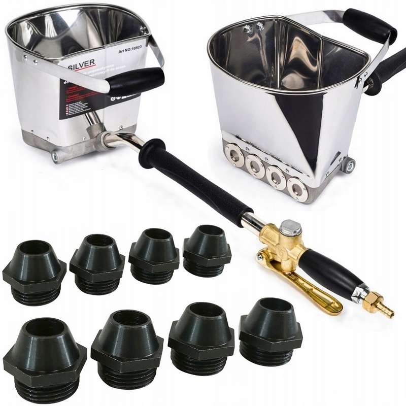 Dodatkowe dysze redukcyjne tworzą uniwersalny zestaw dzięki czemu zestaw idealnie sprawdzi się przy tynkowaniu natryskowym większością typowych tynków i zapraw murarskich: rzadkich i pół-gęstych zapraw tynkarskich: maszynowych, glinianych, cementowo-wapiennych.