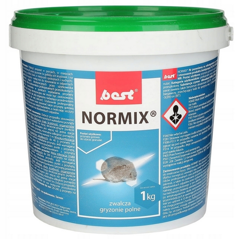 Gotowy do użycia środek gryzoniobójczy BEST NORMIX w formie granulatu działający jako trująca jednodawkowa przynęta pokarmowa. Preparat zawiera denatonium, który ze względu na gorzki smak zapobiega przypadkowemu spożyciu przez ludzi.