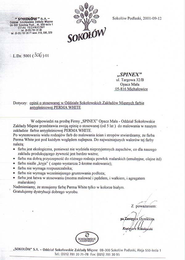 PERMA-WHITE idealnie nadaje się zarówno do sufitów, jak i do ścian. Jest doskonała do wszystkich powierzchni wewnętrznych gdyż jest zmywalna i można ją szorować wodą oraz wodą z mydłem. PERMA-WHITE przeznaczona jest do łazienek, ale jest także idealna do kuchni, piwnic, wilgotnych komórek, pralni, łaźni, szatni i innych wnętrz, w których problemem może być pleśń lub wilgoć. Szczególnie przydatna w intensywnie używanych pomieszczeniach w szkołach, szpitalach, domach opieki i restauracjach. Stosowana przez największe zakłady przemysłu spożywczego zarówno w chłodniach, magazynach jak i na produkcji.