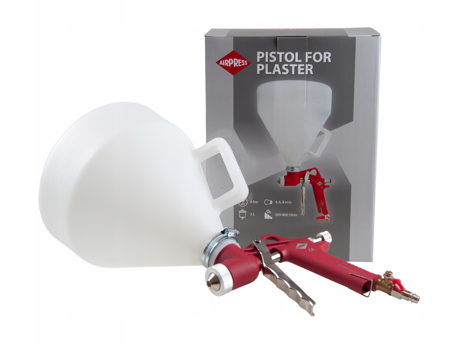 Przedmiotem aukcji jest pistolet pneumatyczny do malowania i tynkowania ze zbiornikiem 5L marki Airpress. Pistolet posiada wydajny plastikowy zbiornik z wbudowanym chwytakiem ułatwiającym rozpylanie na sufitach i ścianach. Pojemnik pistoletu zakryty jest do połowy co umożliwia malowanie sufitów bez stosowania żadnych dodatkowych kolanek, pokryw itp. rozwiązań. Pistolet wykonany jest z wysokiej jakości materiałów więc jest lekki, wygodny i bezpieczny w eksploatacji, łatwy w czyszczeniu i wytrzymały.