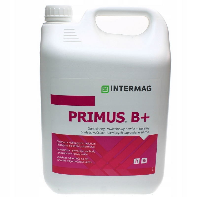 PRIMUS B+ to zmodyfikowany i wzbogacony zawiesinowy nawóz mineralny zawierający składniki pokarmowe, które po naniesieniu na nasiona w trakcie przygotowania materiału siewnego, stają się łatwo dostępne dla tworzącego się systemu korzeniowego w okresie kiełkowania i początkowego rozwoju roślin.