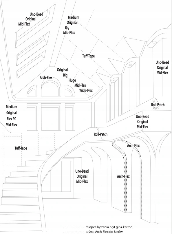 - Taśmę ARCH-FLEX znajduje zastosowanie tam gdzie narożniki wewnętrzne lub rogi zewnętrzne ścian przechodzą z linii prostych w łuki.