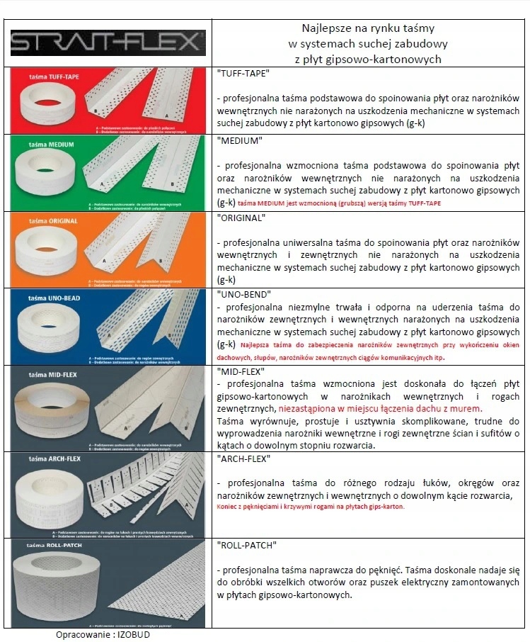 - Taśmy STRAIT-FLEX służą do łączeń płyt kartonowo-gipsowych w miejsce siatki, fizeliny, taśmy papierowej i taśmy papierowej z wkładka aluminiową.