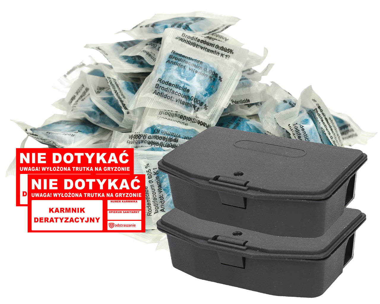 - 2 karmniki deratyzacyjne oraz 2 naklejki informacyjne do oznaczania karmników w zestawie!