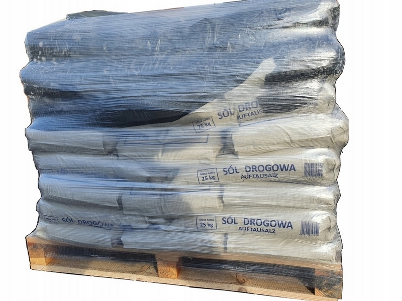 40 worków soli drogowej na palecie o wadze 25 kg netto z opisem produktu (razem 1000kg netto)