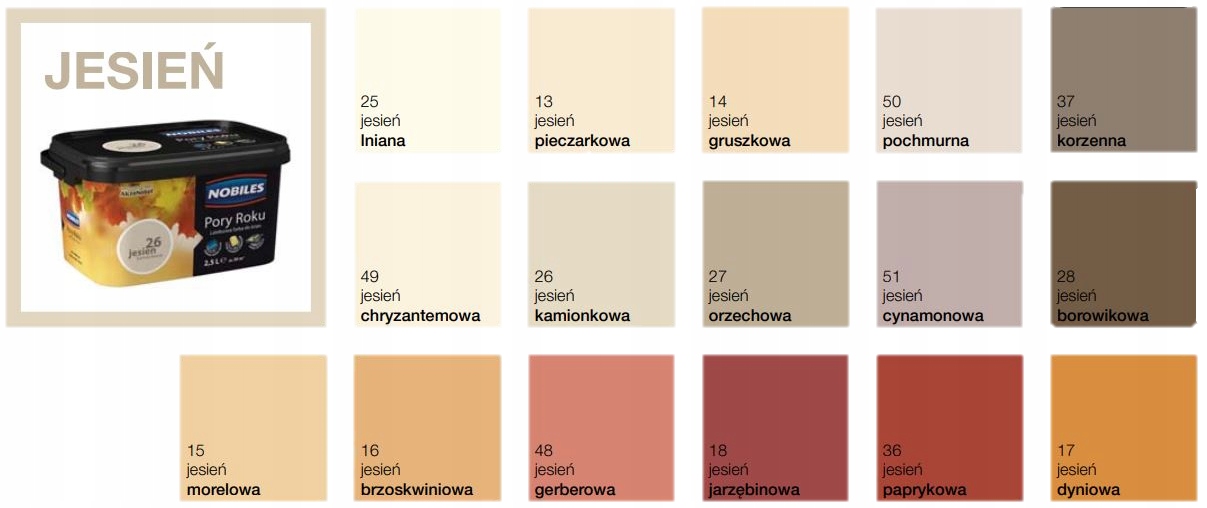 Nobiles Pory Roku lateksowa farba do ścian to kolekcja matowych farb dostępnych w innowacyjnych gamach kolorystycznych, przeznaczonych do dekoracyjnego malowania ścian i sufitów wewnątrz pomieszczeń. Farby z kolekcji Pory Roku tworzą powłoki o wysokich walorach dekoracyjnych, charakteryzujących się doskonałym kryciem, trwałością i czystością barw. Dzięki mikroporowatej strukturze umożliwiają oddychanie ścian. Farby Pory Roku zalecane są do podłoży cementowo-wapiennych, betonowych, gipsowych i kartonowo-gipsowych, również wcześniej malowanych farbami emulsyjnymi. Można zmywać z nich lekkie zabrudzenia.