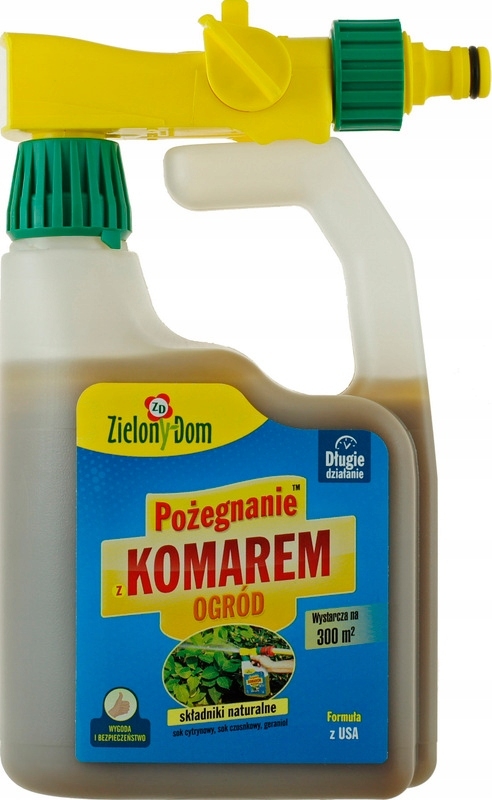 Produkt w wygodnym opakowaniu z rozpylaczem do odstraszania komarów w okolicy domów (np. w ogrodach).