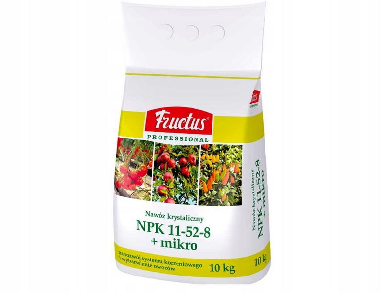 Professional NPK 11-52-8 + mikro to wieloskładnikowy, mineralny nawóz ogrodniczy z wysoką zawartością fosforu. Stymuluje rozwój systemu korzeniowego i krzewienie roślin. Szczególnie zalecany w okresie niskich temperatur wpływających na ograniczenie pobierania fosforu z gleby lub innych podłoży. Nawóz przeznaczony jest do nawożenia wielu gatunków roślin, szczególnie w początkowym okresie ich wzrostu i rozwoju, a także przed owocowaniem (odpowiednie wybarwienie owoców).