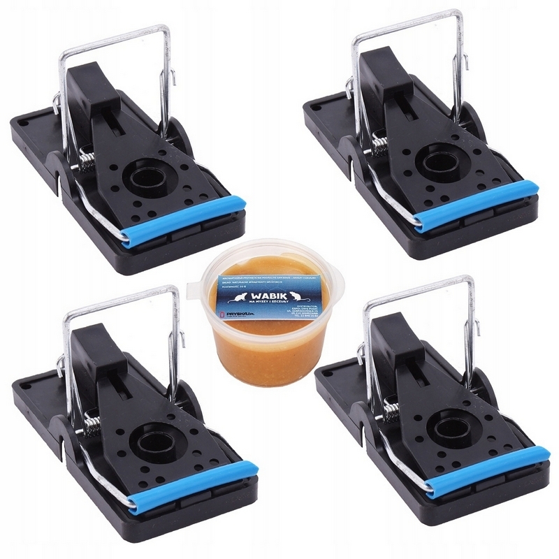 ZESTAW NA MYSZY: 4 x PUŁAPKA GILOTYNKA + WABIK NA MYSZY I SZCZURY 30 G