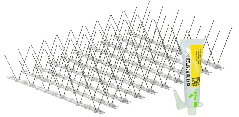 Nierdzewne kolce na gołębie AVIK R20 - zestaw 3 metrów bieżących - 9 elementów w zestawie + mały klej 70ml.