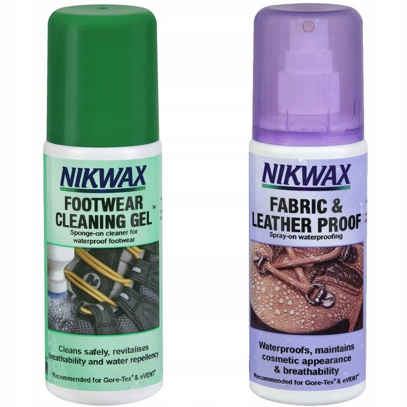 W skład zestawu wchodzi impregnat oraz żel do czyszczenia obuwia. Impregnat Nikwax Tkanina i skóra jest łatwy w aplikacji, dzięki poręcznemu opakowaniu z atomizerem. Poprzez swoje właściwości impregnat odnawia warstwę DWR obuwia, ograniczając absorpcję wody. Dodatkowo wspomaga oddychalność obuwia.
