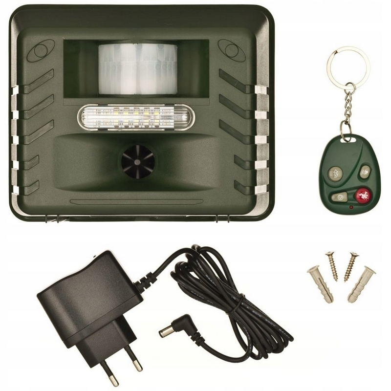 Ultradźwiękowy odstraszacz zwierząt firmy Nature odstraszy niepokojące zwierzęta w sposób humanitarny i bezpieczny. Używa kombinacji trzech różnych funkcji, by wystraszyć zwierzęta: ultradźwięku, migających świateł i alarmu dźwiękowego. Urządzenie działa przeciwko kotom, psom, lisom, kunom, czaplom, gołębiom, szczurom, myszom i innym zwierzętom wykrywanym przez czujnik. Ultradźwięk jest ustawiany dla jednego lub większej liczby gatunków zwierząt, w zależności od pożądanego okresu roboczego. Głośność alarmu dźwiękowego jest także regulowana. Model działa na czterech bateriach 1,5 V typu C, które nie są częścią przesyłki. Pilot zdalnego sterowania jest częścią przesyłki.