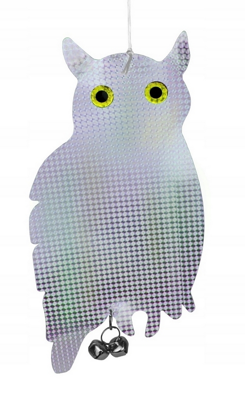 Odblaskowy dwustronny odstraszacz uporczywych ptaków w kształcie siedzącej sowy z dzwonkami. Skutecznie odstrasza niepożądane ptaki takie jak: kawki, wróble, szpaki, gołębie, wrony i wiele innych. Dzięki holograficznej powłoce odstraszacz daje wrażenie trójwymiarowości. Efekt odstraszający potęgują dwa dzwoneczki zamontowane na spodzie sowy. Produkt przeznaczony do zawieszenia na dedykowanym sznurku w górnej części. Świetnie sprawdza się przy ochronie domów, balkonów, ogródków i upraw.